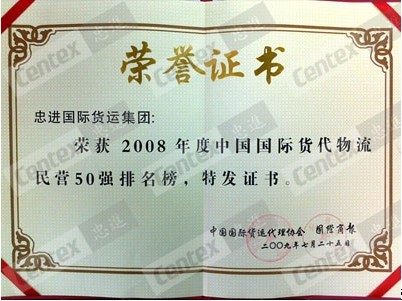 榮獲“2008年度中國國際貨代物流民營50強(qiáng)”證書
